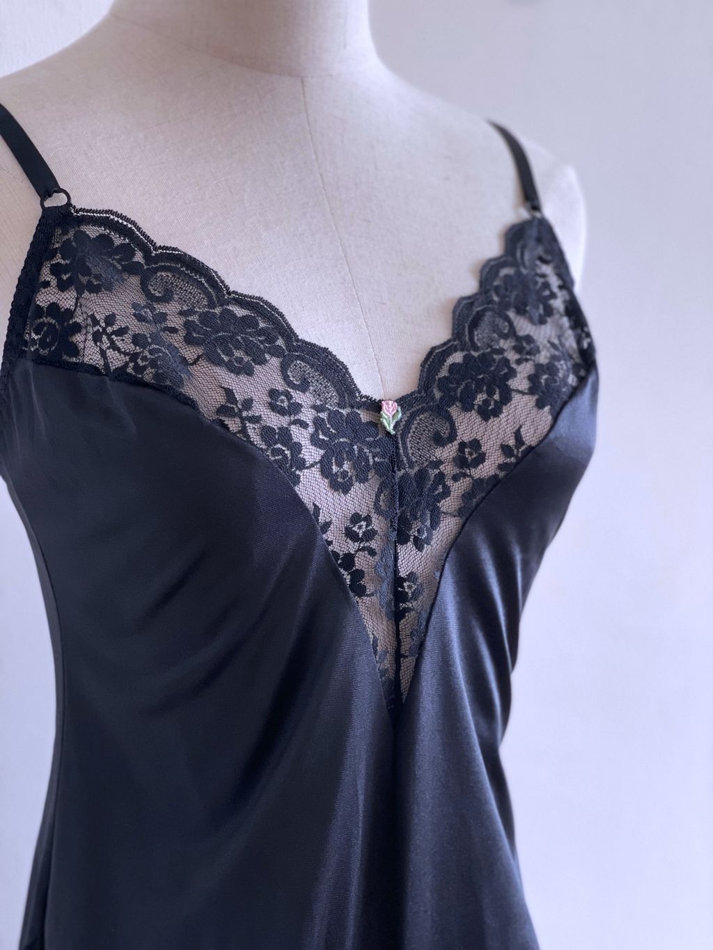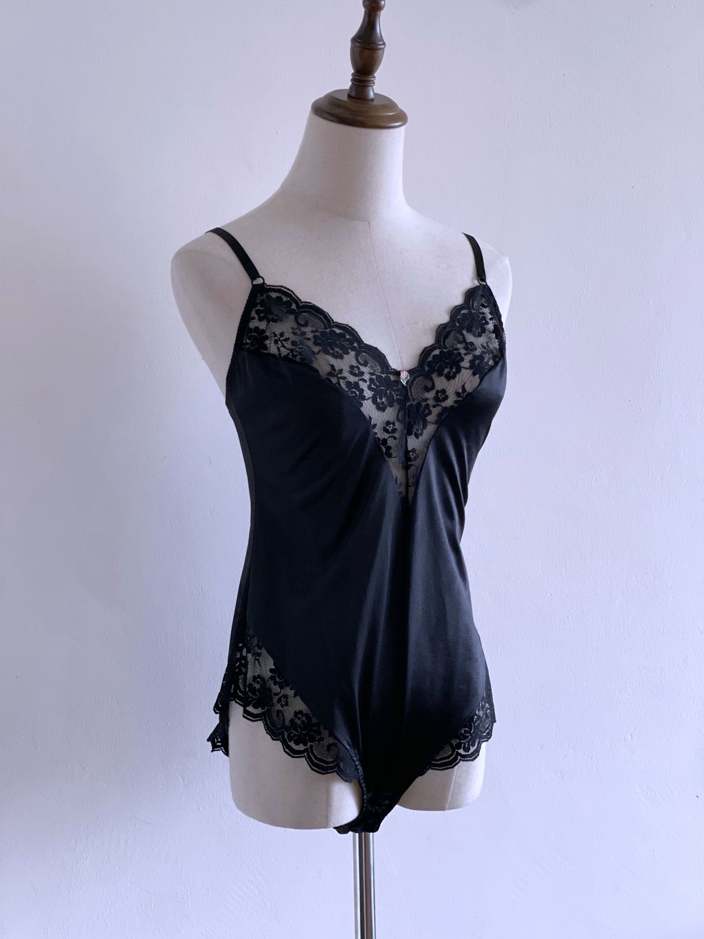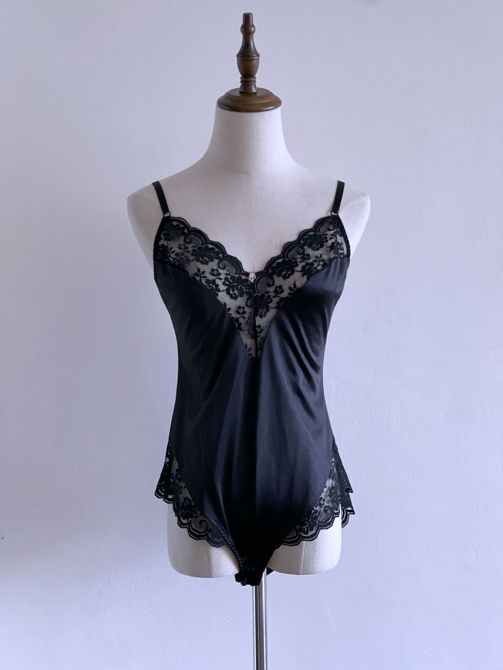 A vintage Chantilly Maidenform teddy with ILGWU tag, crafted with a glossy satin bodice that glides softly against the skin. The silhouette is framed with delicate lace trims along the neckline and leg openings, finished with rose embroidery for a touch of timeless romance. Elegant, feminine, and effortlessly alluring.