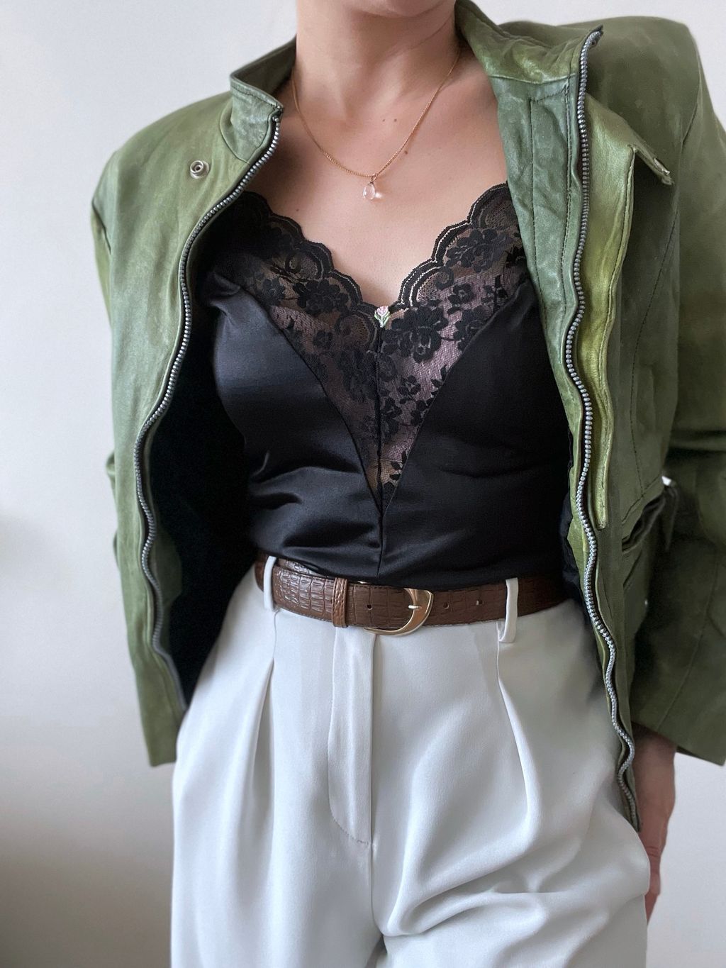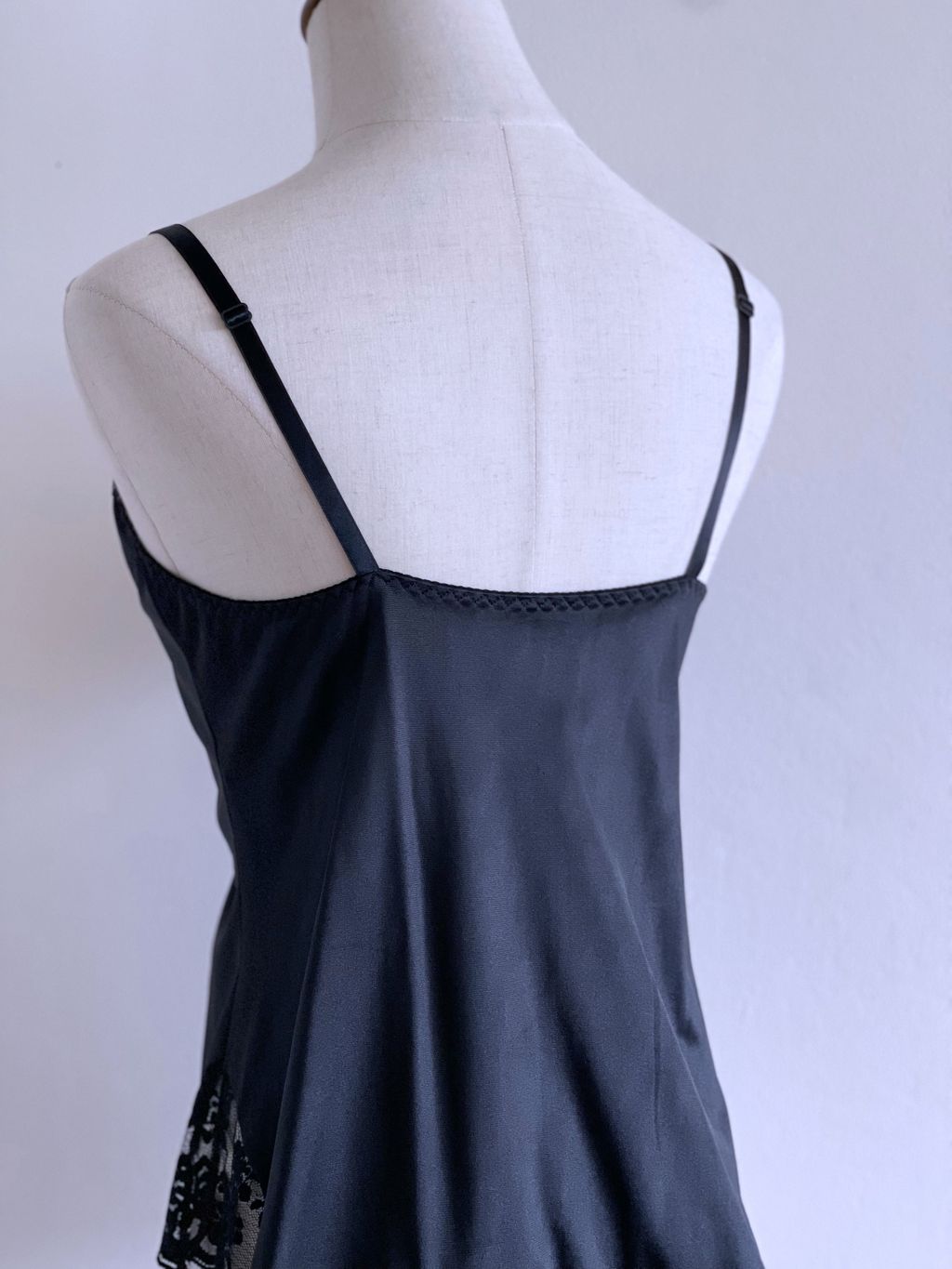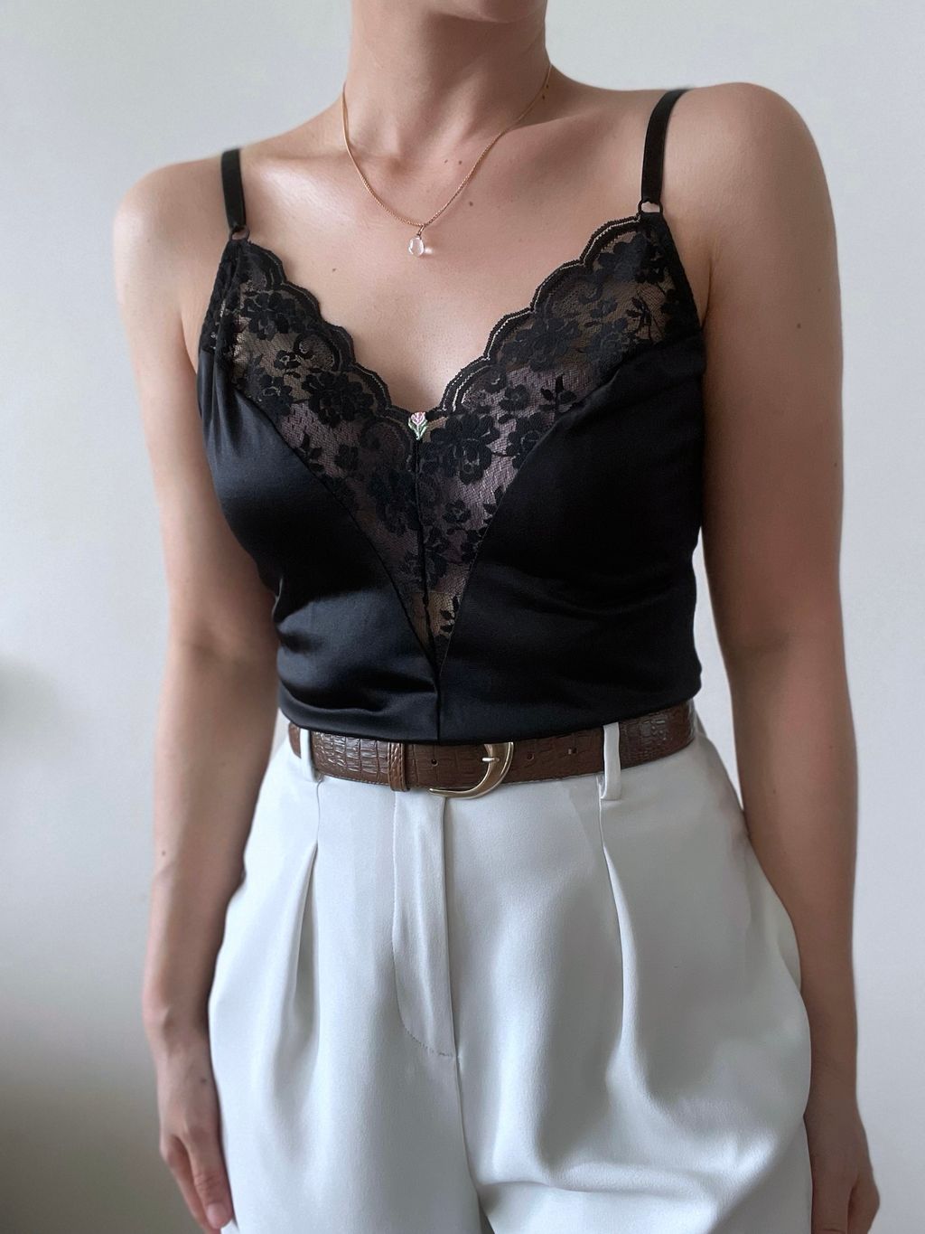 A vintage Chantilly Maidenform teddy with ILGWU tag, crafted with a glossy satin bodice that glides softly against the skin. The silhouette is framed with delicate lace trims along the neckline and leg openings, finished with rose embroidery for a touch of timeless romance. Elegant, feminine, and effortlessly alluring.